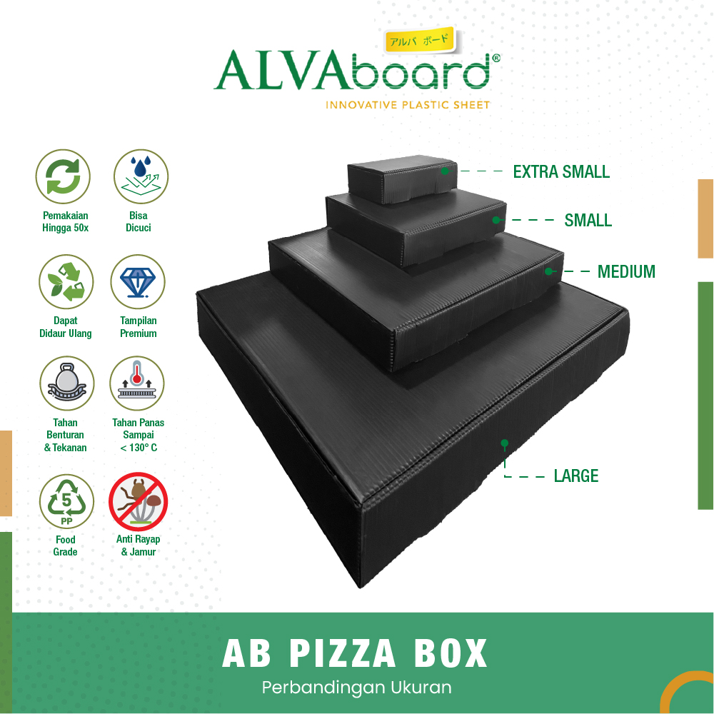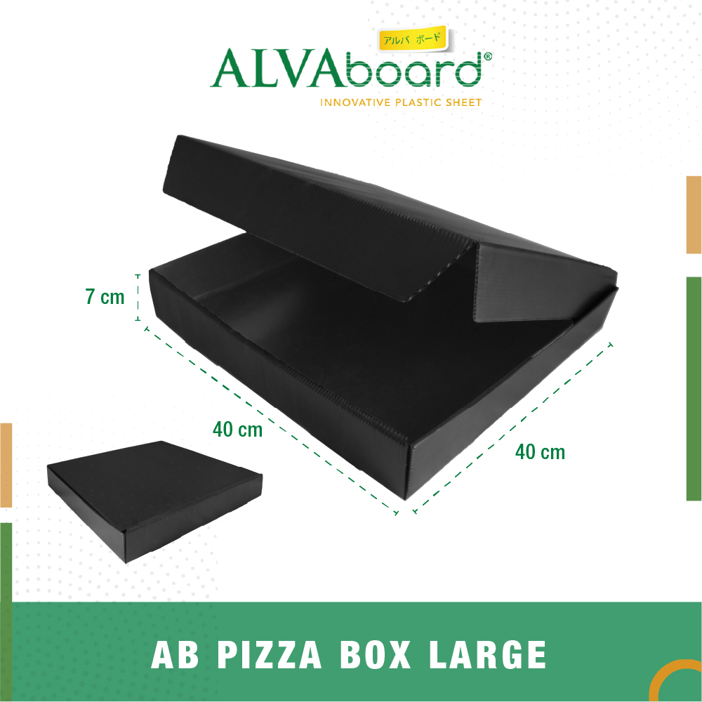 ALVAboard Box Pizza Large merupakan inovatif #kardusjamanow terbuat dari bahan Polypropylene (PP) Board kualitas premium dari ALVAboard yang memiliki banyak keunggulan, dan multifungsi.