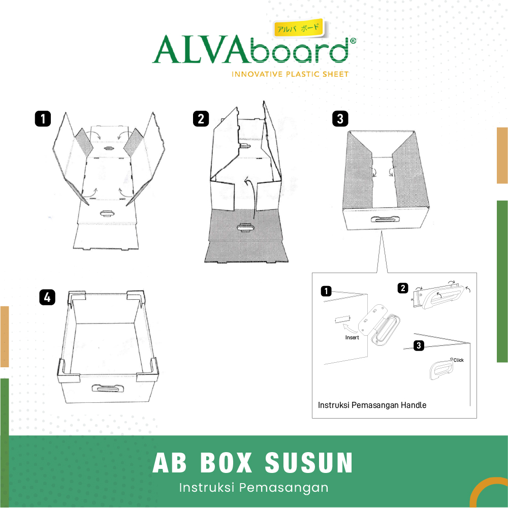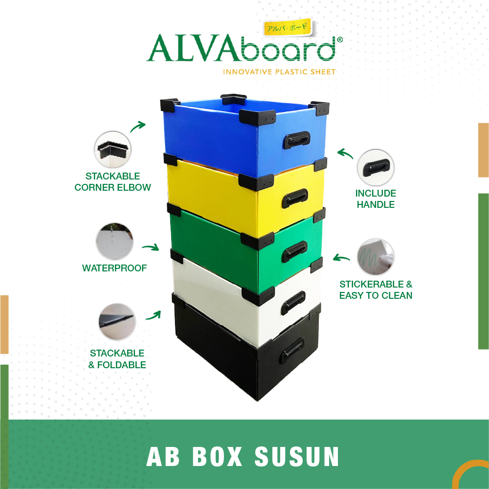 Berbahan Polypropylene (PP) kualitas premium yang melindungi box dari kerusakan, terkena rayap, atau terkena jamur. ALVAboard Box Susun Flat Pack ini juga dapat digunakan hingga ratusan kali dengan masa pakai yang panjang. Berukuran 40 x 30 x 17,5 Cm dan tersedia dalam 5 varian warna, hijau, kuning, biru, putih, dan hitam.