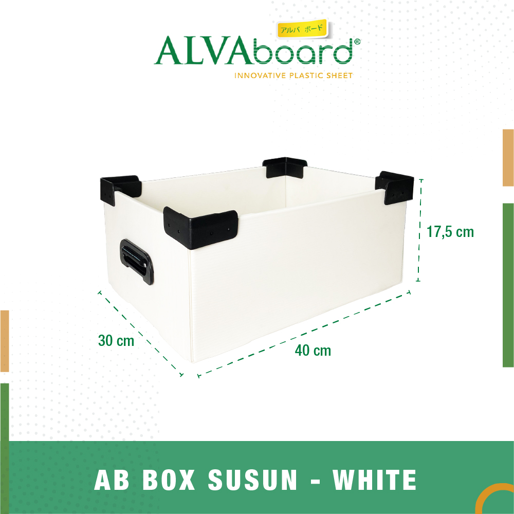 ALVAboard Box Susun Flat Pack Ukuran 40 x 30 x 17,5 Cm berguna sebagai tempat penyimpanan barang – barang seperti ATK, dokumen, ataupun untuk penyimpanan barang lainnya dengan cara ditumpuk susun ke atas.